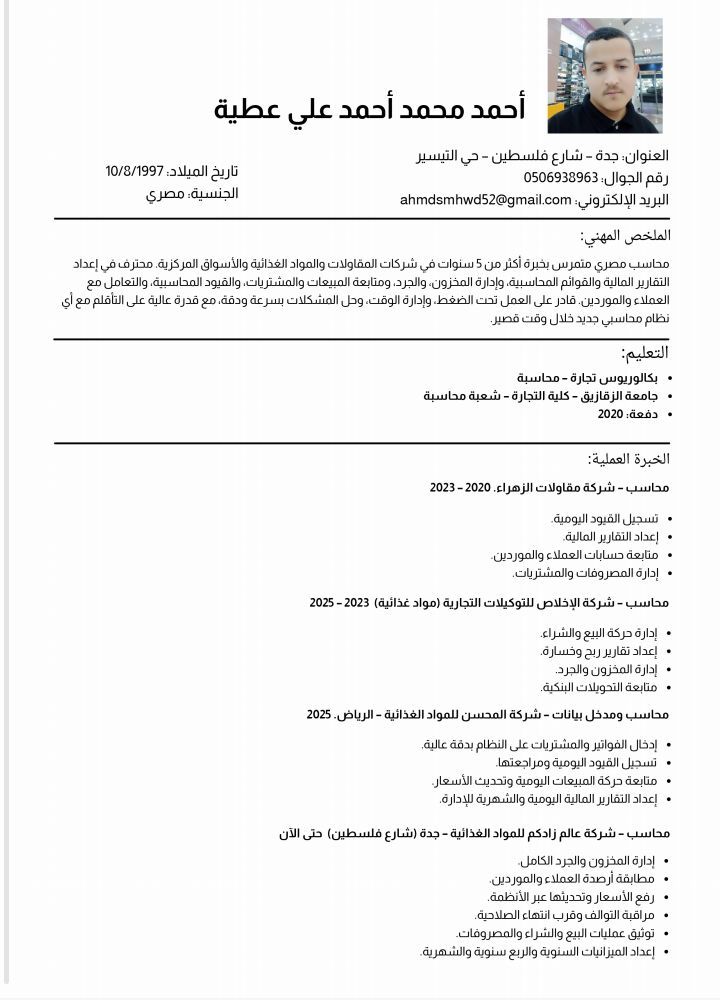 أنا أحمد سم هود 28 سنة أنا محاسب ومدخل بيانات وكشير وأمين مخزن مصري متمرس ساكن في جدة خريج جامعة الزقازيق كلية تجارة شعبة محاسبه 2019 خبرة أكثر من خمس سنوات في المحاسبه ونقاط البيع وادخال البيانات وفي استخدام البرامج زي اكتف بيونت ومون لايت وأودو واكسل وكريستال وسماك وقيود ودفتره وغيره وسريع الكتابة على الكيبورد خبرة في عمل القوائم المالية والتقارير اليوميه والقيود ربح وخسارة وحقوق ملكية وميزانية