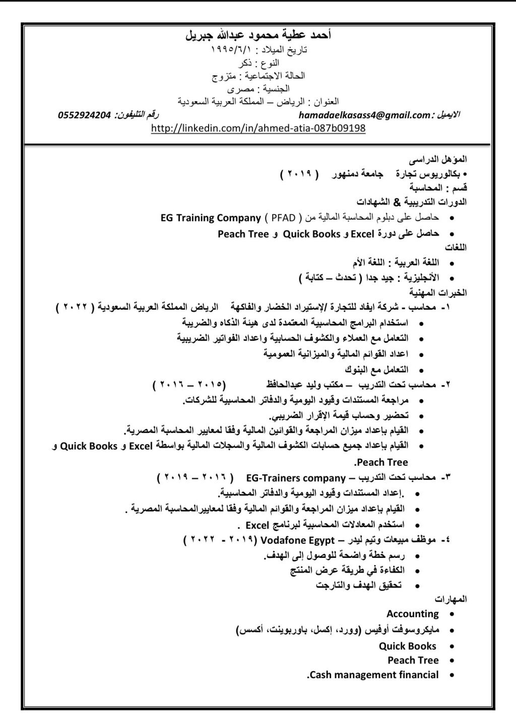 محاسب خبرة 3 سنوات في الإدارة المالية والمحاسبة في شركة التجارة والاستيراد والتصدير والتخليص الجمركي والقيام بكافة العمليات المحاسبية والنظام المحاسبي وهيئة الزكاة والضريبة