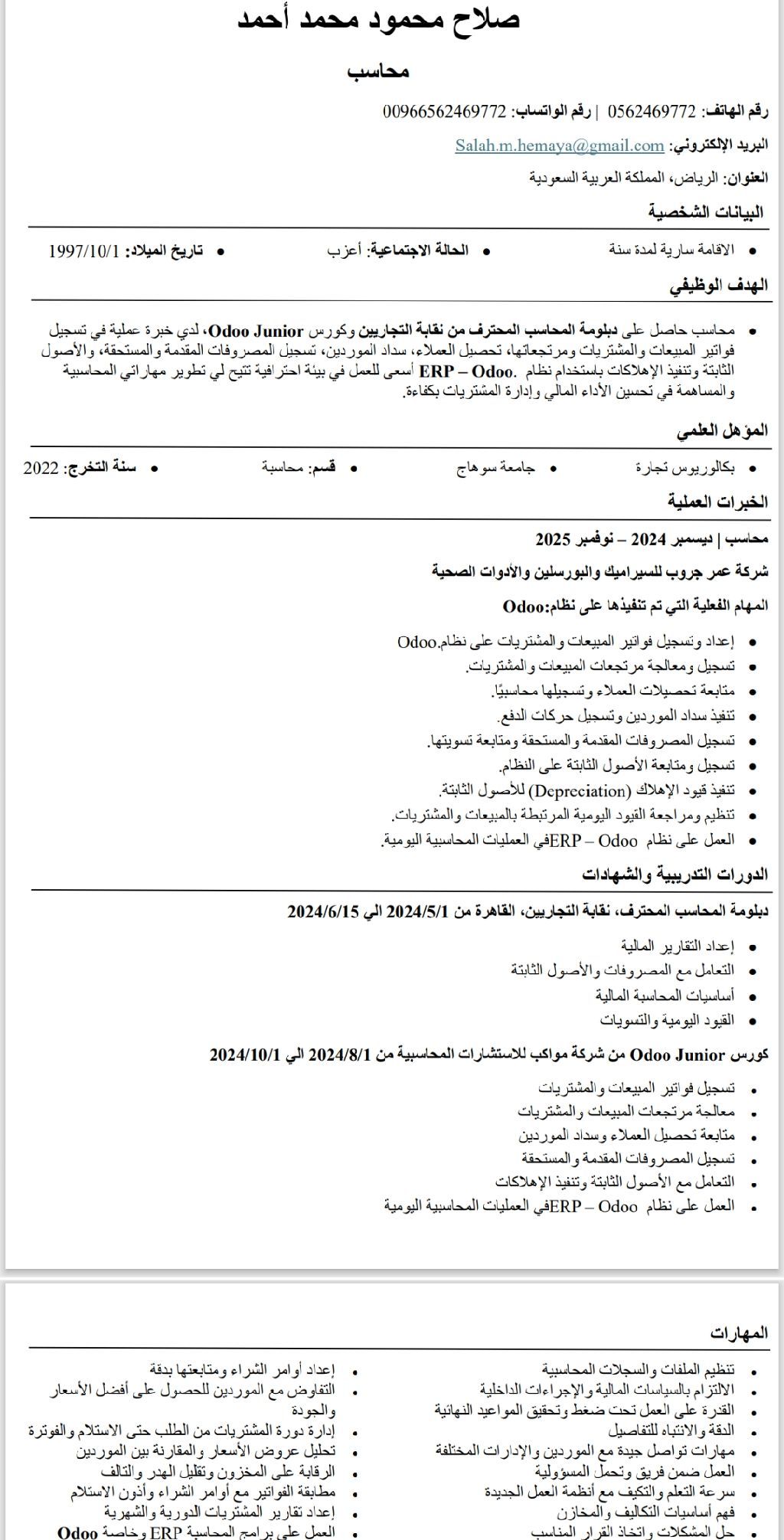 مصري الجنسية حاصل علي بكالوريوس تجارة مقيم في الرياض خبرة بمجال الحسابات من تسجيل قيود العمليات المختلفة وفواتير المبيعات والمشتريات ومطابقه الحسابات للعملاء والموردين القدرة علي استخدام البرامج المحاسبية ERP junior odoo accountant خبرة باستخدام برامج الكمبيوتر Microsoft office world & excel وبرامج ادخال البيانات القدرة علي العمل تحت ضغط وضمن فريق وتنظيم المهام والوقت إقامة سارية وقابلة للنقل