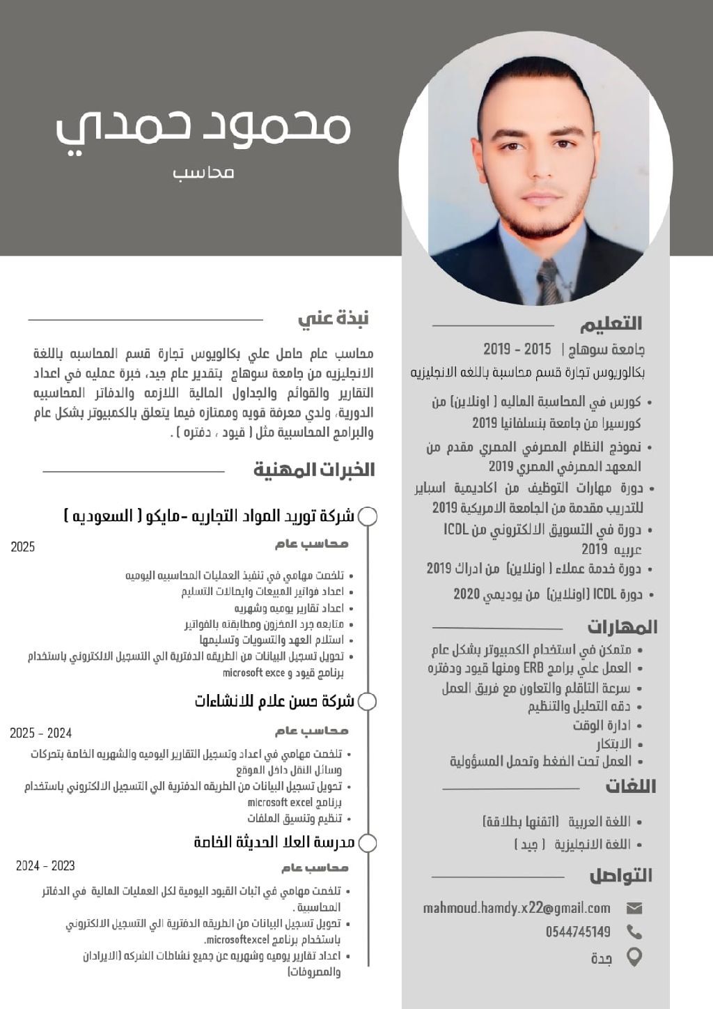 محاسب عام ابحث عن فرصة عمل داخل المملكة العربية السعودية. لدي خبرة في الأعمال المحاسبية والمالية، واعداد القيود اليومية، ومتابعة الحسابات، واعداد التقارير المالية، والتعامل مع العملاء والموردين. أجيد العمل على برامج المحاسبة وExcel، ولدي قدرة على التنظيم وتحمل ضغط العمل، والالتزام بالمواعيد والدقة في الأداء. إقامة سارية قابلة للنقل جاهز للعمل فورا، وقابل للعمل بدوام كامل أو جزئي حسب طبيعة العمل