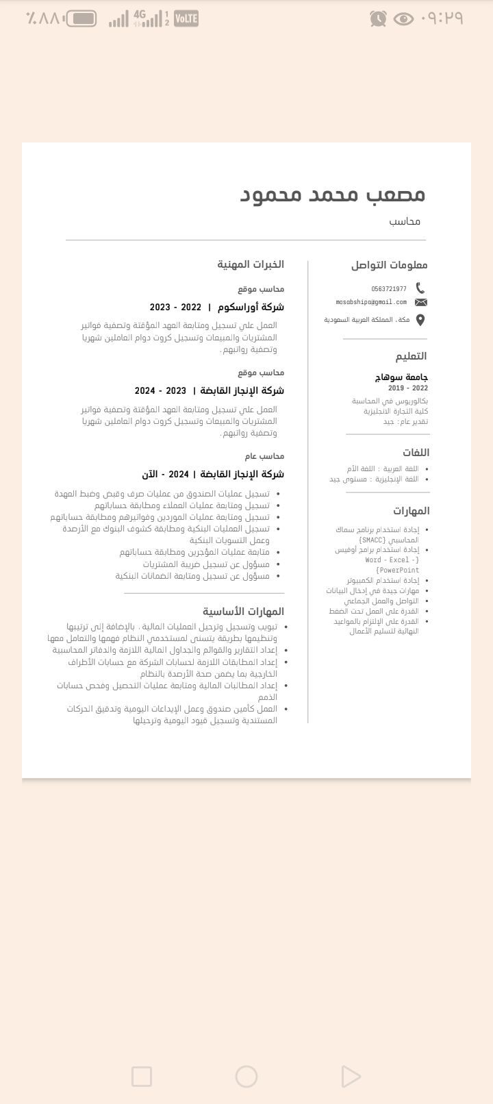 أنا مصعب محمد محمود حاصل على بكالوريوس تجارة شعبة محاسبه خبرة 2 سنة في مجال المحاسبة محترف في برامج المايكروسوفت افويس. أرغب في العمل كمحاسب وأرجو الجديه الكاملة في التعامل
