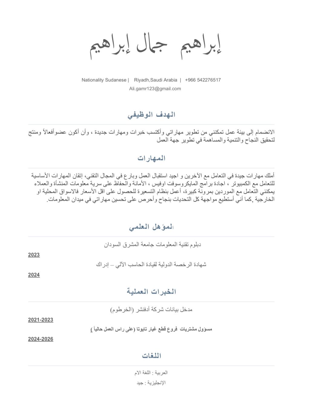 مسؤول مشتريات فروع قطع غيار تويوتا خبرة سنتين إقامة سارية رخصة قيادة مسؤول من فرعين حاليا على رأس العمل حاليا، الجنسية سوداني اعمل نظام التسعير