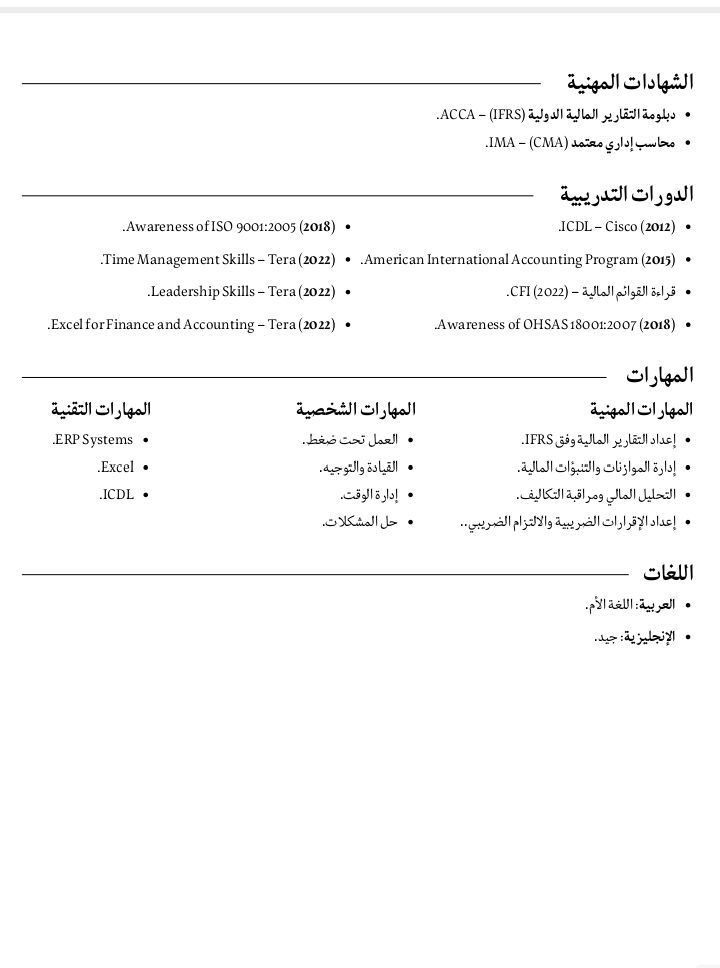 رئيس حسابات / محاسب أول، ابحث عن عمل حيث امتلك خبرة تزيد عن 15 عاما في المحاسبة المالية والادارية، اعداد التقارير، إدارة التكاليف، الميزانيات، والزكاة والضرائب. كما انني حاصل على شهادة CMA وIFRS Diploma. خلال مسيرتي المهنية، شاركت في تطوير الأنظمة المالية، وتحسين التقارير، وقيادة فريق المحاسبة، وتنفيذ الأقفال الشهري والسنوي بكفاءة عالية