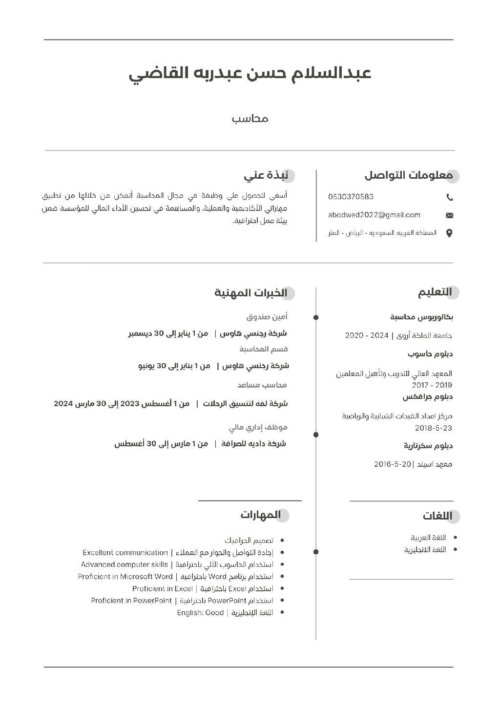 خريج محاسبة، أجيد استخدام الحاسوب الآلي وبرامج الأوفيس، حاصل على دورة سكرتارية، ودبلوم جرافيكس، بالاضافة الى دورة في برنامج Inox Pro. امتلك مهارات تنظيمية جيدة، والقدرة على التعلم السريع والعمل ضمن فريق