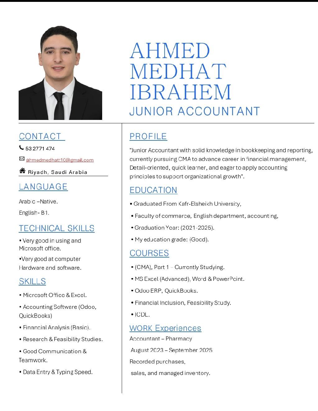 مطلوب فرصة عمل - محاسب (داخل السعودية) محاسب حديث تخرج ابحث عن فرصة عمل مناسبة داخل المملكة. لدي معرفة جيدة ب المحاسبة المالية - قيود اليومية - تسويات الصندوق والبنك - متابعة العملاء والموردين - العمل على برامج المحاسبة (Odoo - Quickbooks) اجادة Excel - جيد في اللغة الانجليزية ملتزم، سريع التعلم، وجاهز للعمل فورا