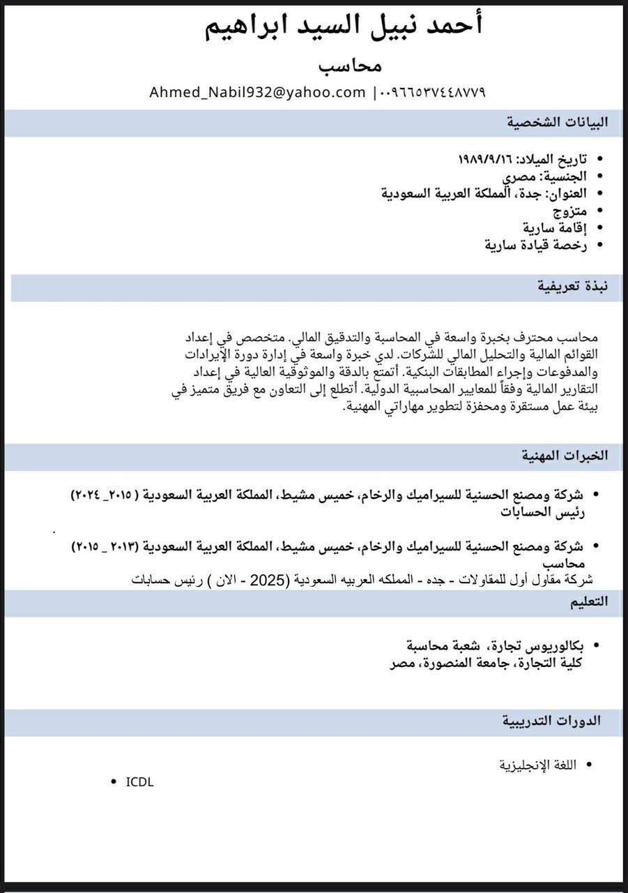 مدير حسابات ومحاسب أول مصري خبرة 13 سنة في الحسابات والادارة الماليه والتقارير الماليه والقوائم الماليه واعداد الحسابات والاشراف المحاسبي خبرة كاملة في الضريبة المضافة والزكاة خبرة في الشركات التجاريه والمقاولات أحمل إقامة نظاميه مقيم في جدة وجاهز للنقل في أي مكان في المملكة وجاهز لعمل المقابله حضوريا أو عن بعد امتلك سيارة خاصه