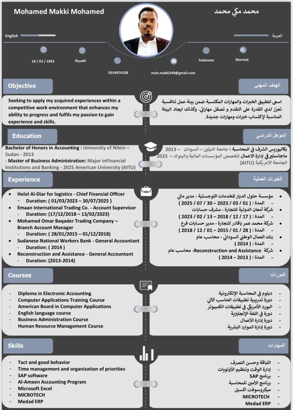 مدير حسابات واداري سوداني الجنسية’ خبرة 10 سنوات داخل المملكة في اعداد وادارة وتنظيم الحسابات واعداد القوائم والتقارير المالية والضرائب وتقديم الاقرارات الضريبية والتعامل مع البرامج المحاسبية وخبرة ومهارات ادارية وتنظيمية وقدرات تحليلية ومهارات المتابعة والاشراف علي القسم المالي خبرة في الشوؤن الادارية وعمل HR مكان الإقامة الرياض