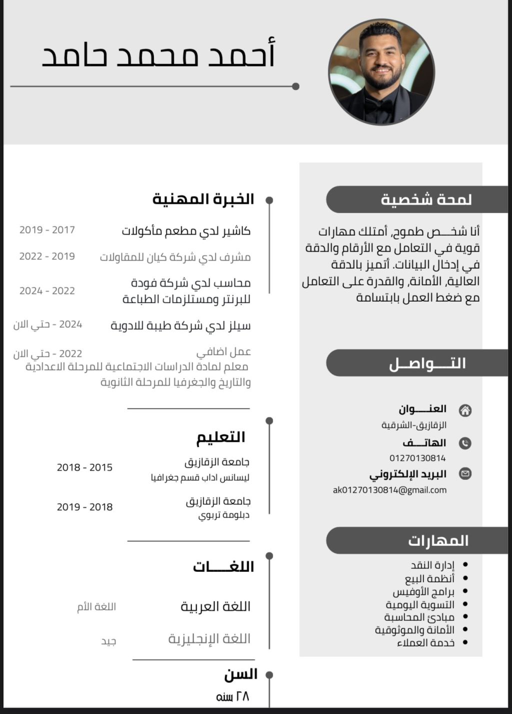 أنا في مصر وأحتاج الى عمل كاشير أو محاسب وأنا غير مدخن وملتزم وأحب العمل أرجو التوصل علي رقمي اللي في CV