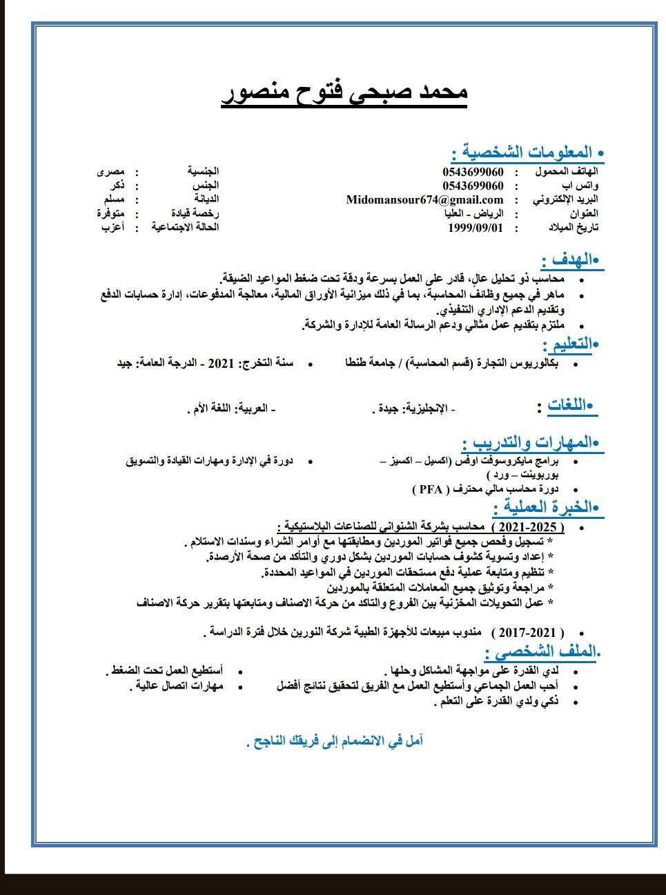 محاسب حديث التخرج يجيد عمل القيود الماليه ومتابعه حسابات العملاء والموردين واعداد التقارير الماليه وعمل تحليل للتكاليف والمبيعات واعداد فواتير المبيعات ومراقبه المخزون
