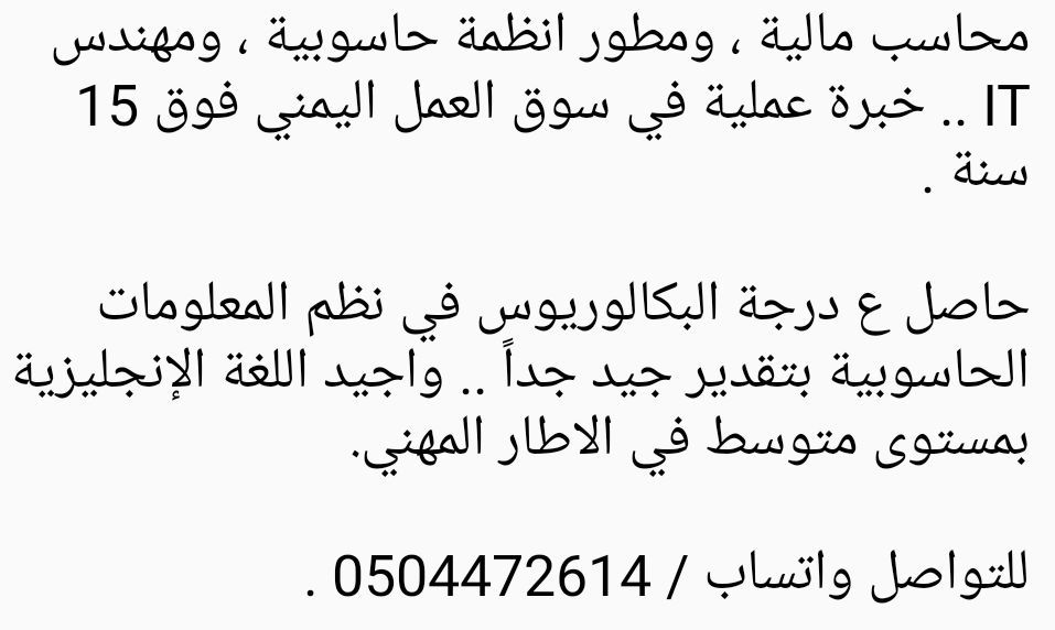 محاسب مالية، ومطور أنظمة حاسوبية، ومهندس IT. خبرة عملية في سوق العمل اليمني فوق 15 سنة. حاصل ع درجة البكالوريوس في نظم المعلومات الحاسوبية بتقدير جيد جدا. وأجيد اللغة الانجليزية بمستوى متوسط في الاطار المهني. للتواصل