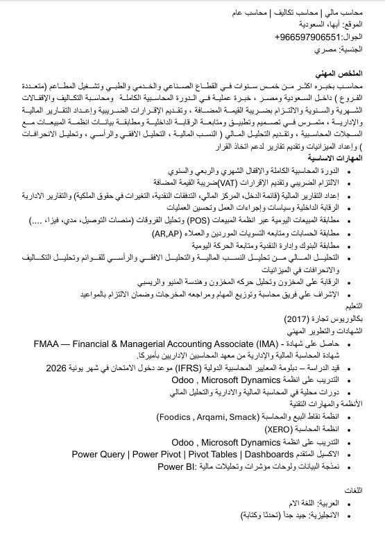 محاسب بخبرة أكثر من خمس سنوات في القطاع الصناعي والخدمي والطبي والمطاعم (متعددة الفروع) داخل السعودية حاصل علي شهادة FMAA في المحاسبة المالية والادارية، خبرة عملية في الدورة المحاسبية الكاملة ومحاسبة التكاليف والإقفالات الشهرية والسنوية والالتزام بالمعايير الدوليه وتقديم الاقرارات الضريبية واعداد القوائم المالية والادارية لاتخاذ القرار وتقديم التحليل المالي وتحليل انحرافات التكاليف أبها خميس