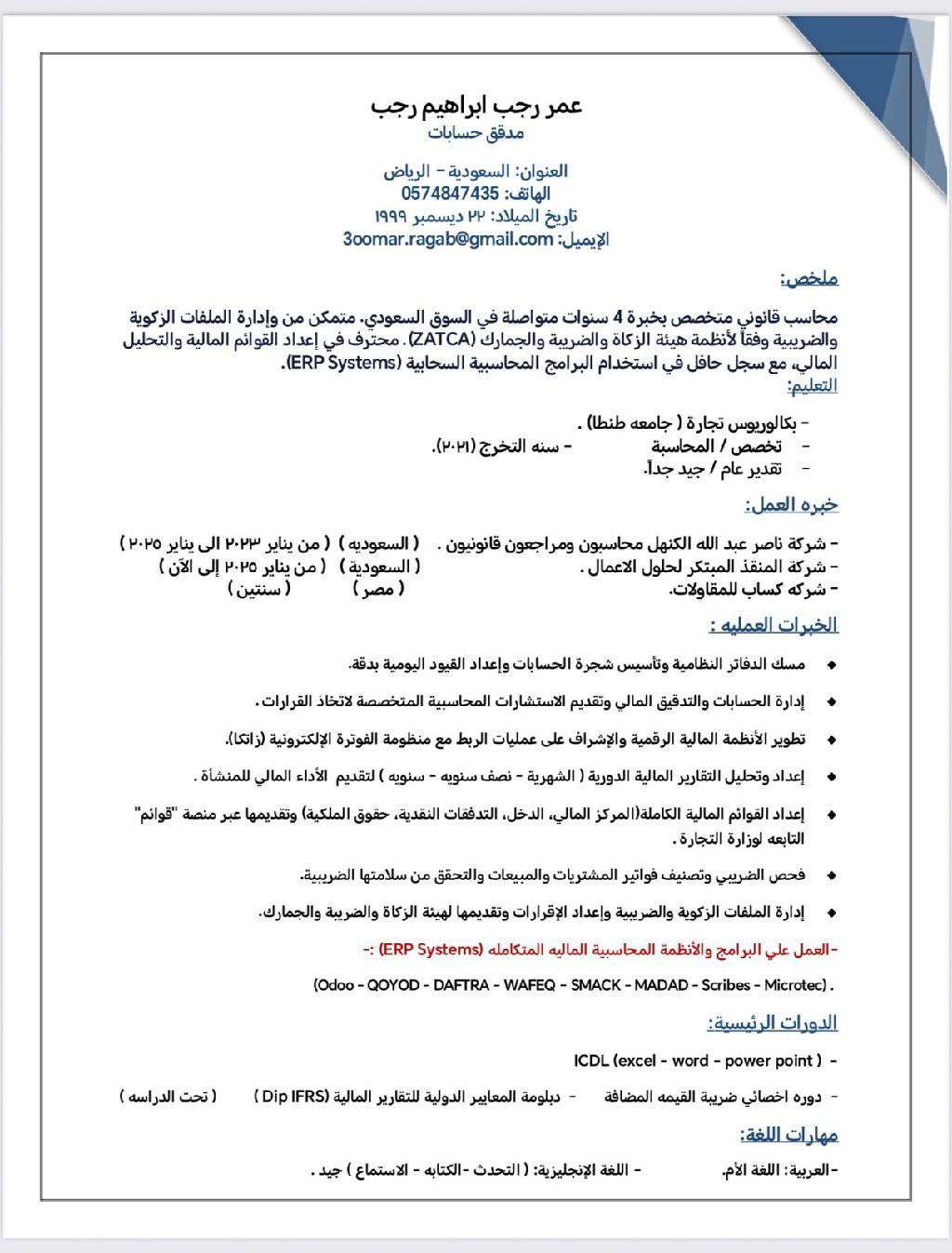 محاسب مالي قانوني خبرة 4 سنوات في السعودية في اعداد القوائم الماليه والتدقيق وادارة الملفات الزكوية والضريبيه