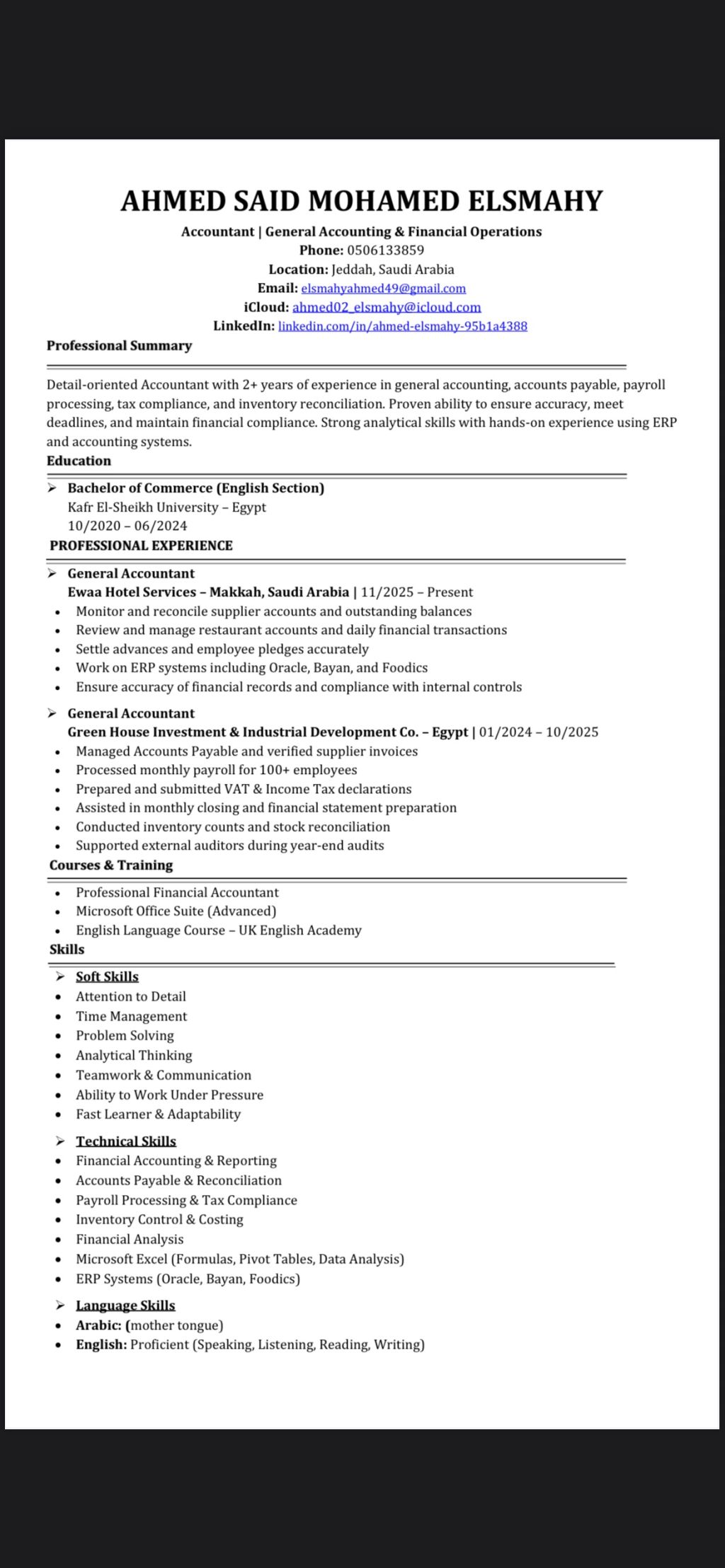 ابحث عن فرصة عمل كمحاسب في شركة أو مؤسسة مرموقة، حيث أسعى لتوظيف خبراتي ومهاراتي في الإدارة المالية والمحاسبية لتحقيق أفضل النتائج. امتلك خبرة سنة ونصف في التسجيل اليومي للعمليات المالية. إجراء المطابقات البنكية ومطابقات العملاء والموردين. اعداد القوائم المالية. مرتبات الموظفين. حساب ضريبة القيمة المضافة والزكاة