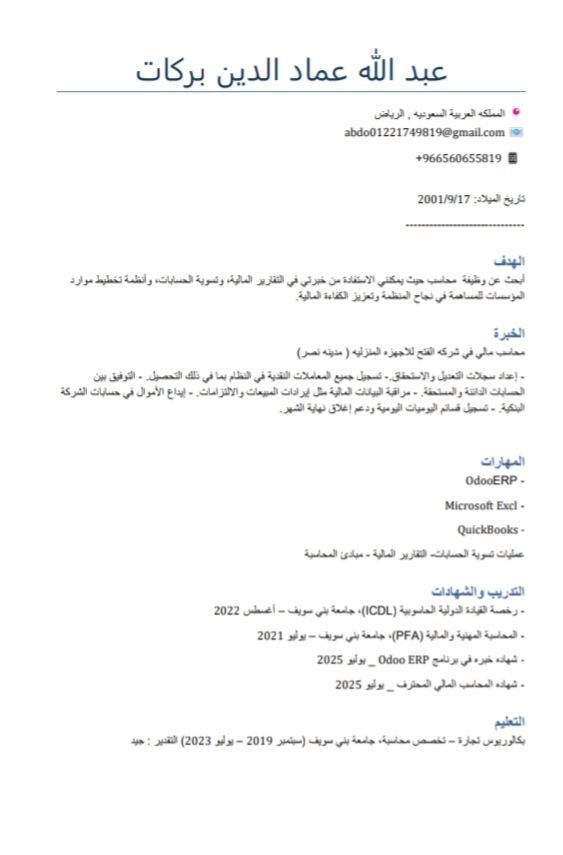Professional Financial Accountant - PFA & Odoo ERP Experienced financial accountant working in commercial companies, holding the PFA (Professional Financial Accountant) and Odoo ERP certifications. Proficient in general ledger accounting, journal entries, etc