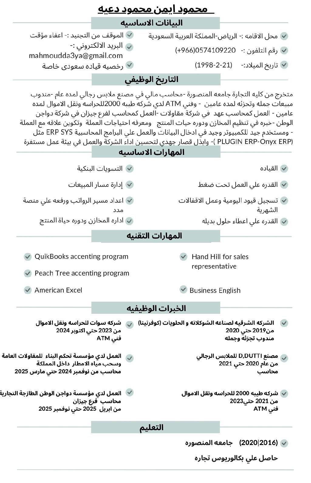 محمود أيمن محاسب مصري حاصل علي بكالوريوس تجارة جامعة المنصوره خريج 2020 العمر 28 أملك إقامة سارية ورخصة قيادة خيره في قيود اليوميه - الإقفالات الشهريه - متابعه حركة المخزون - التسويات البنكية - اعداد وتنفيذ مسيرات الرواتب ورفعها علي منه مدد - تصفية حساب العهد - مطابقه ومراجعة حساب العملاء والموردين المساعده في اعداد القوائم الماليه اعداد ورفع الاقرار الضريبي وتقديم التقارير الماليه خبرة في البرامج