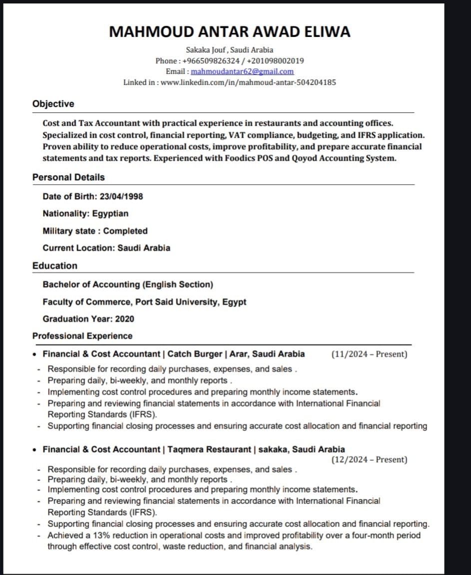 Cost and Financial Accountant with experience using Foodics and managing restaurant and commercial accounts. Developed a comprehensive Excel - based accounting system for sales, purchases, expenses, advances, bank, and reporting. Skilled in costing, cost analysis, waste calculation, product pricing, and recipe setup. Strong knowledge of IFRS، Journal entries, VAT, ready