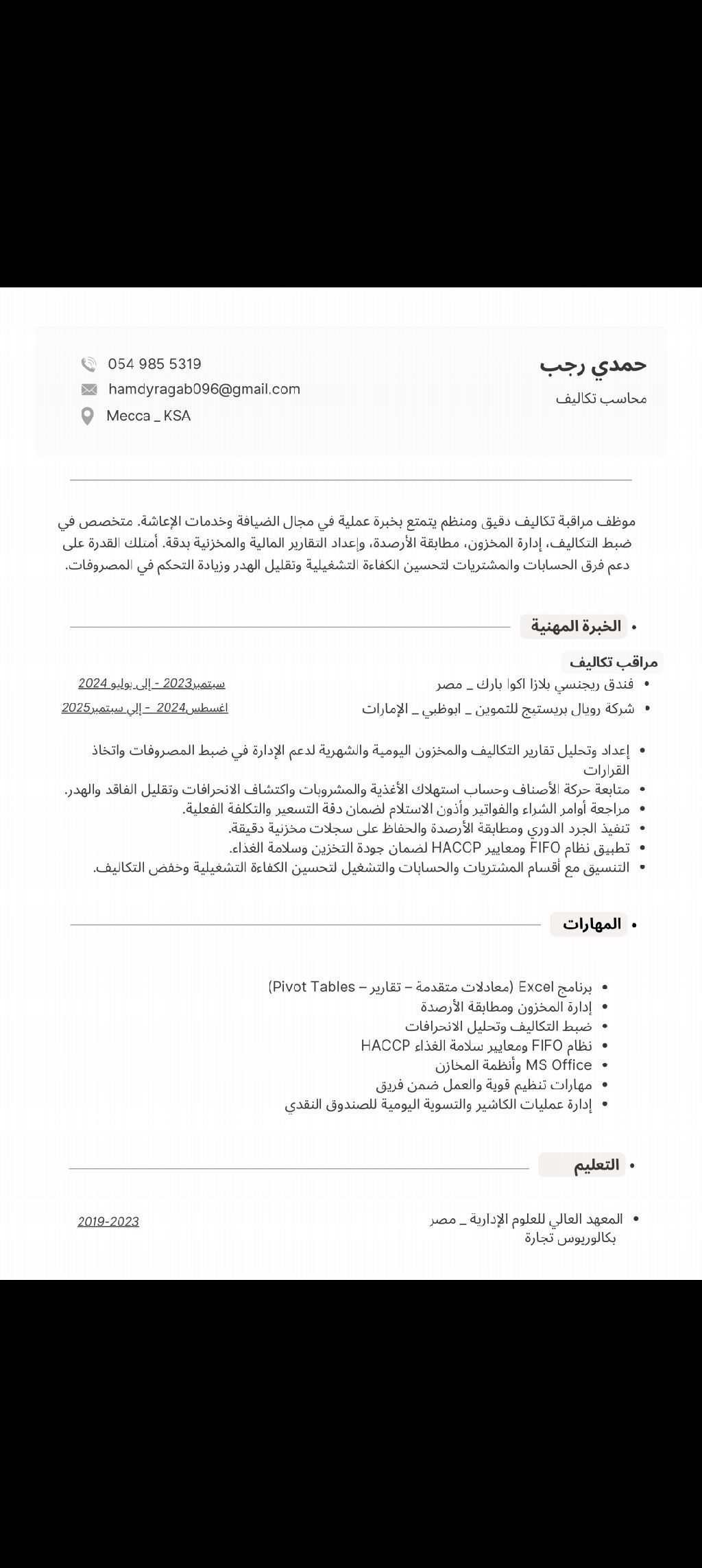 الاسم حمدي رجب السعيد الجنسية مصري المسمى الوظيفي موظف تكاليف مخازن باحث عن فرصة عمل مناسبة في المملكة العربية السعودية، لدي خبرة في مجال محاسبة التكاليف وإدارة المخازن، وتشمل متابعة المخزون وحركة الأصناف اعداد وتحليل تقارير التكاليف الجرد الدوري ومطابقة الأرصدة تسجيل العمليات ومتابعة المصروفات اجادة استخدام الحاسب الآلي أتميز بالجدية والالتزام والدقة في العمل، والقدرة على تحمل ضغط العمل