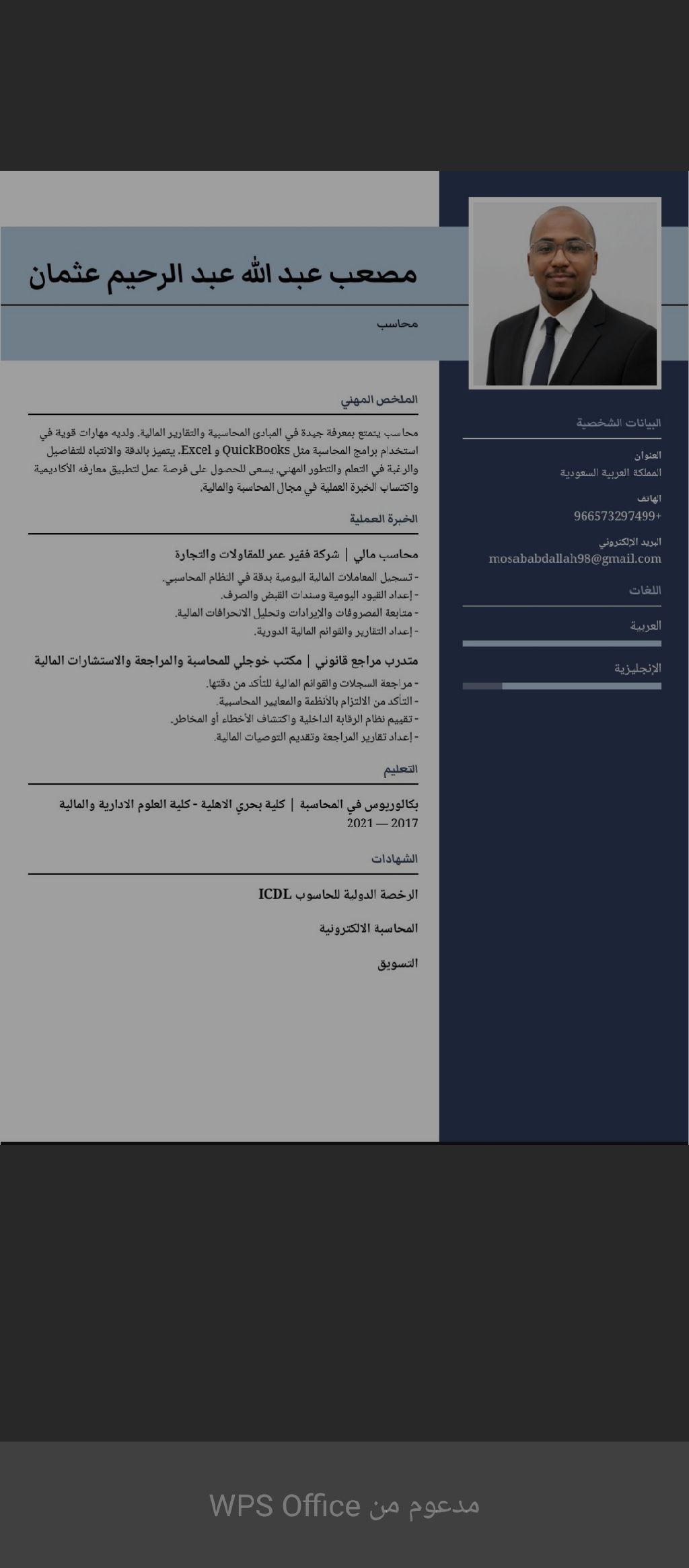 I am a Sudanese accountant with a valid and transferable residency permit, ready to work throughout the Kingdom. I am proficient in accounting, financial reporting, taxes, inventory management, cost management, payroll, and everything related to the financial accounting department. Call and