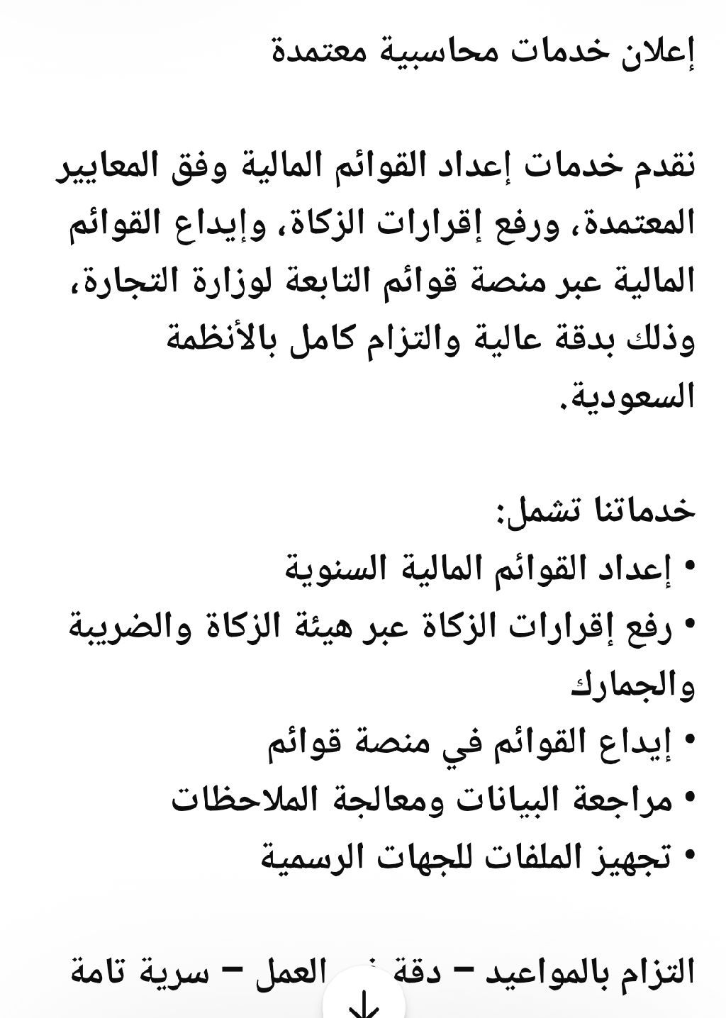 رفع اقرار الزكاة، واعداد وايداع القوائم المالية للمنشاءات الصغيرة والمتوسطة المعفاة من تعيين محاسب قانوني نقدم خدمات اعداد القوائم المالية وفق المعايير المعتمدة، ورفع اقرارات الزكاة، وايداع القوائم المالية عبر منصة قوائم التابعة لوزارة التجارة، وذلك بدقة عالية والتزام كامل بالأنظمة السعودية