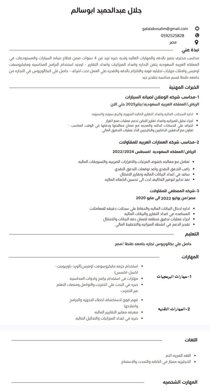 Egyptian accountant, 28 years old, currently residing in Riyadh, seeking a job opportunity in the accounting field. I have the ability to record daily journal entries, prepare financial reports, follow up on customer and supplier accounts, and work with accounting software and Excel. I am characterized by accuracy, honesty, and the ability to work under pressure. I am looking forward to joining a