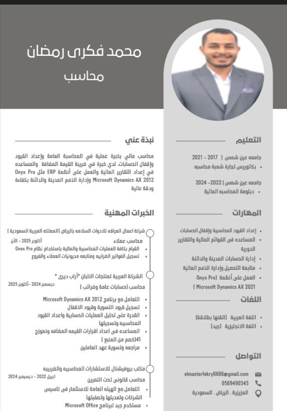 محاسب مصري، حاصل علي بكالوريوس ودبلومه في المحاسبه الماليه خبرة لأكثر من ثلاثه سنوات في مصر بالمملكة السعودية (محاسب عام. ضرائب. عملاء)