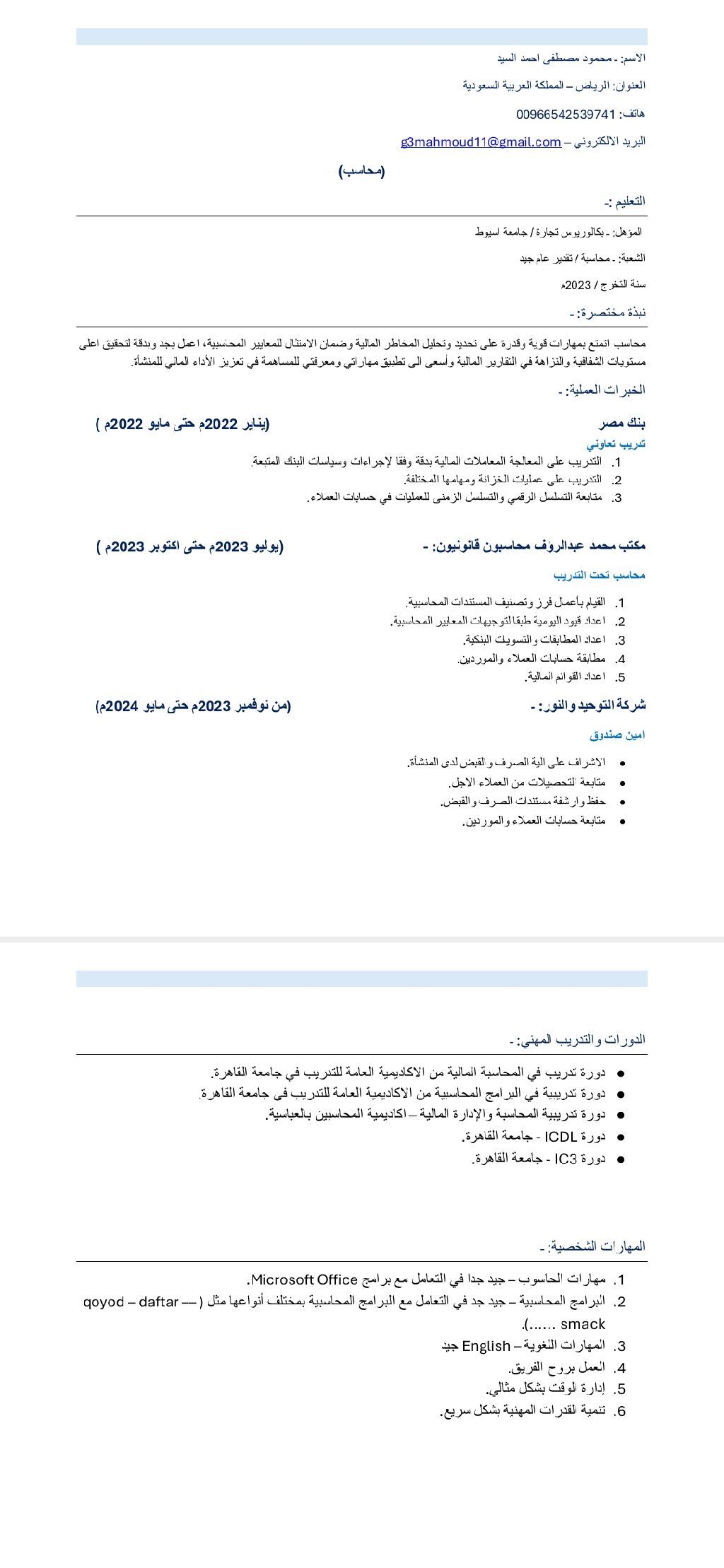 Egyptian accountant seeking employment in the field of accounting. Experienced in recording journal entries and performing bank reconciliations. Valid residency permit for one year