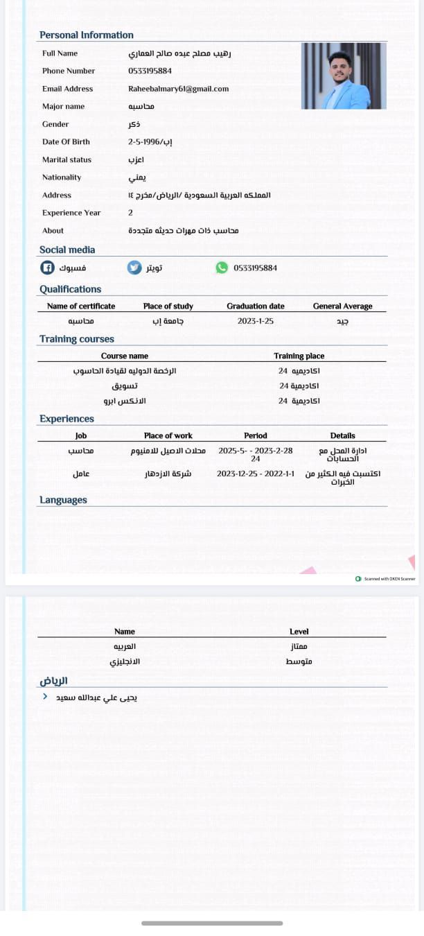 محاسب حاصل على درجة البكالوريوس، أسعى للانضمام الى منشأة أو شركة أتمكن من خلالها من توظيف مهاراتي وتطوير خبراتي المهنية في المجال المحاسبي. لدي خبرة في العمل على الأنظمة المحاسبية، حيث سبق لي استخدام نظام أون اكس برو (Onyx Pro) نظام فودكس (Foodics) الخاص بالمطاعم كما أتمتع بمهارات جيدة في استخدام برنامج Excel، خاصة في تنظيم البيانات واعداد التقارير. الدورات الرخصة الدولية لقيادة الحا