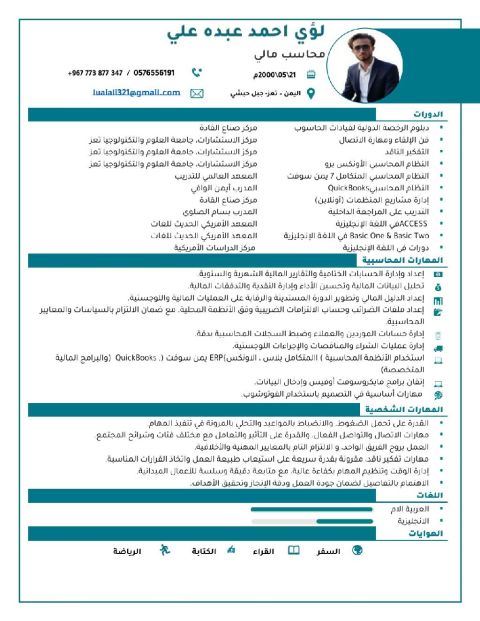 An Egyptian accountant with 16 years of experience in the field of accounting, available to start work immediately, with strong knowledge of Financial accounting General ledger and accounts Preparation of financial reports Working with accounting systems Closing accounts and monitoring expenses and revenues Known for accuracy, commitment, and ability to work under pressure
