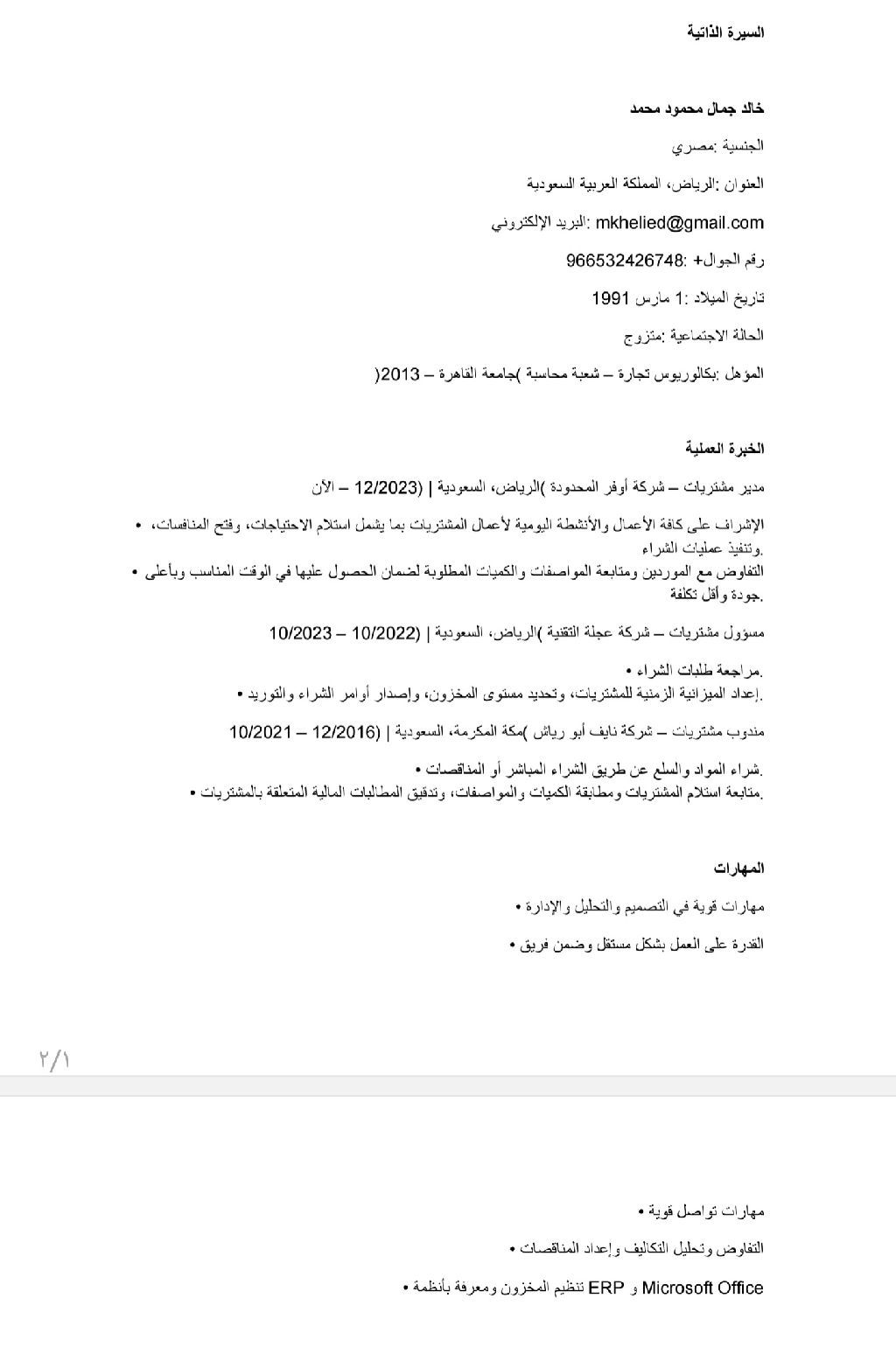 طلب وظيفة مدير مشتريات، مدير مشتريات خالد جمال محمود محمد حاصل على درجة البكالوريوس في شعبة المحاسبة من جامعة بني سويف ولدي خبرة تزيد عن 8 سنوات في مجال المشتريات وإدارة سلسلة التوريد. خلال مسيرتي المهنية، قمت بتطوير وتنفيذ استراتيجيات شراء فعالة، والتفاوض مع الموردين للحصول على أفضل الأسعار