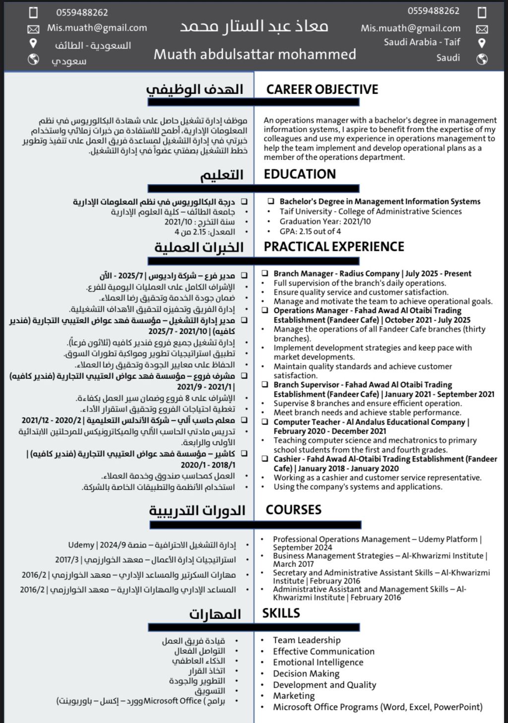 خبرة مدير تشغيل (4 سنوات) 30 فرع وأملك خبرة في هذا المجال (الكافيهات) وأتطلع الى أن تتاح لي فرصة للمساهمة بخبرتي في دعم أهداف الشركة