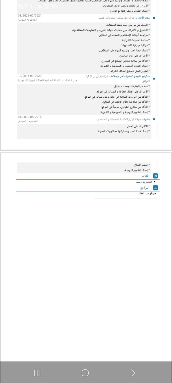 أنا عمر عبد الوهاب أحمد سوداني الجنسية حاصل على بكالوريوس ادارة فندقة وسياحة، ولدي خبرات عملية في مجال (المشتريات والاشراف وخدمات العملاء) وايجادة استخدام برامج اكسل ووورد ابحث عن عمل أخصائي مشتريات أو اشراف ولدي رخصة قيادة سعودية