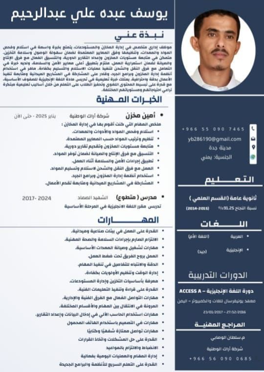 أنا يمني 30 عام مقيم في السعودية وابحث عن فرصة عمل اداري أمين مخزن أو أمين مستودع ولدى خبرة عام في مجال المقاولات العامة ومواد البناء’ ومتواجد حاليا في جدة وقادر على التنقل الى أي مكان
