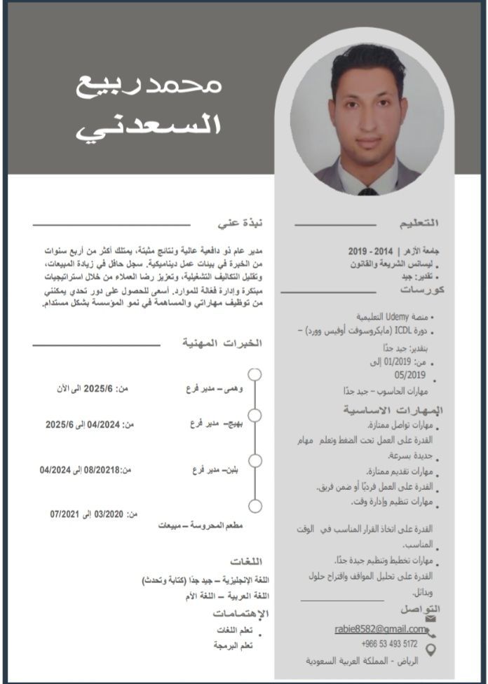 مدير عام ذو دافعيه عالية ونتائج مثبته امتلك أكثر من أربع سنوات من الخبرة في بيئات عمل ديناميكيه سجل حافل في زيادة المبيعات وتقليل التكاليف التشغيليه وتعزيز رضاء العملاء من خلال استراتيجيات مبتكره وادارة فعاله للموارد أسعى للحصول على تحدي يمكنني اثبات مهاراتي والمساهمه في نمو المؤسسة بشكل مستدام