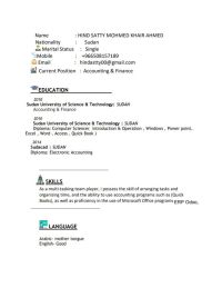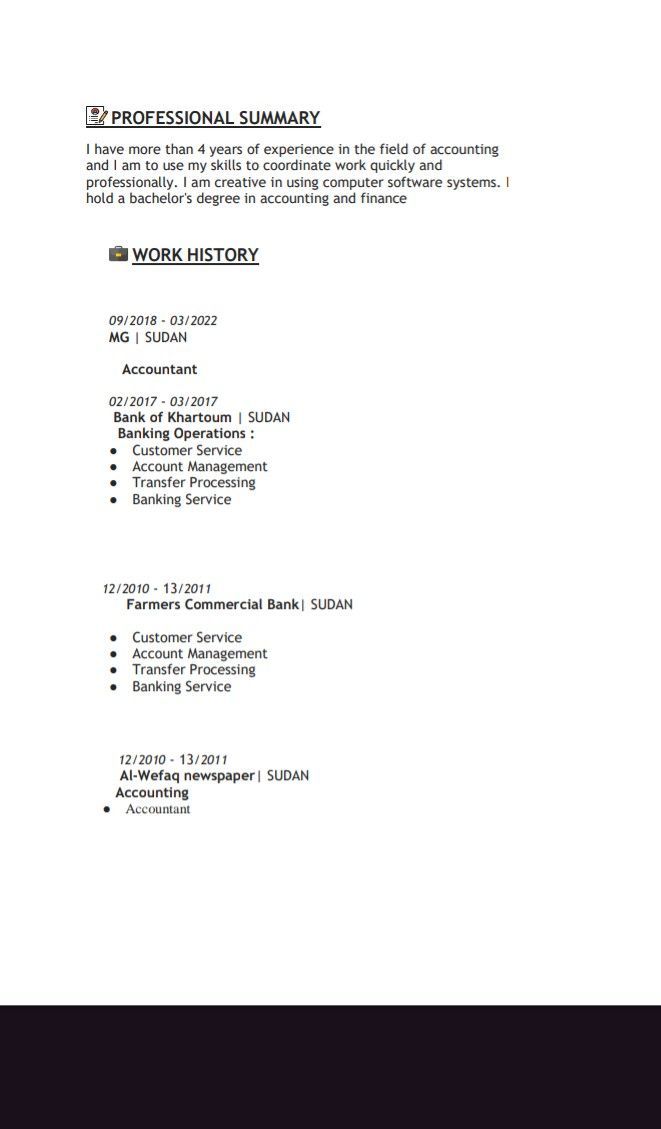 خريج قسم المحاسبة والتمويل جامعة السودان للعلوم والتكنولوجيا لدي شهادة جامعية وشهادة كمبيوتر شهادة دبلوم مايكروسوفت اوفس اكسل، كويك بوكوورد، اكسس، بور بوينت. شهادة دبلوم محاسبة الكترونية، شهادة تطبيق أودو، شهادة اكسل متقدم، أمين مخزن، شهادة تدريب من بنك الخرطوم في جميع وأقسام البنك، بنك المزارع التجاري جميع أقسام البنك، أودو. لدي القدرة علي العمل في روح الفريق، مهارات التواصل، القيادة