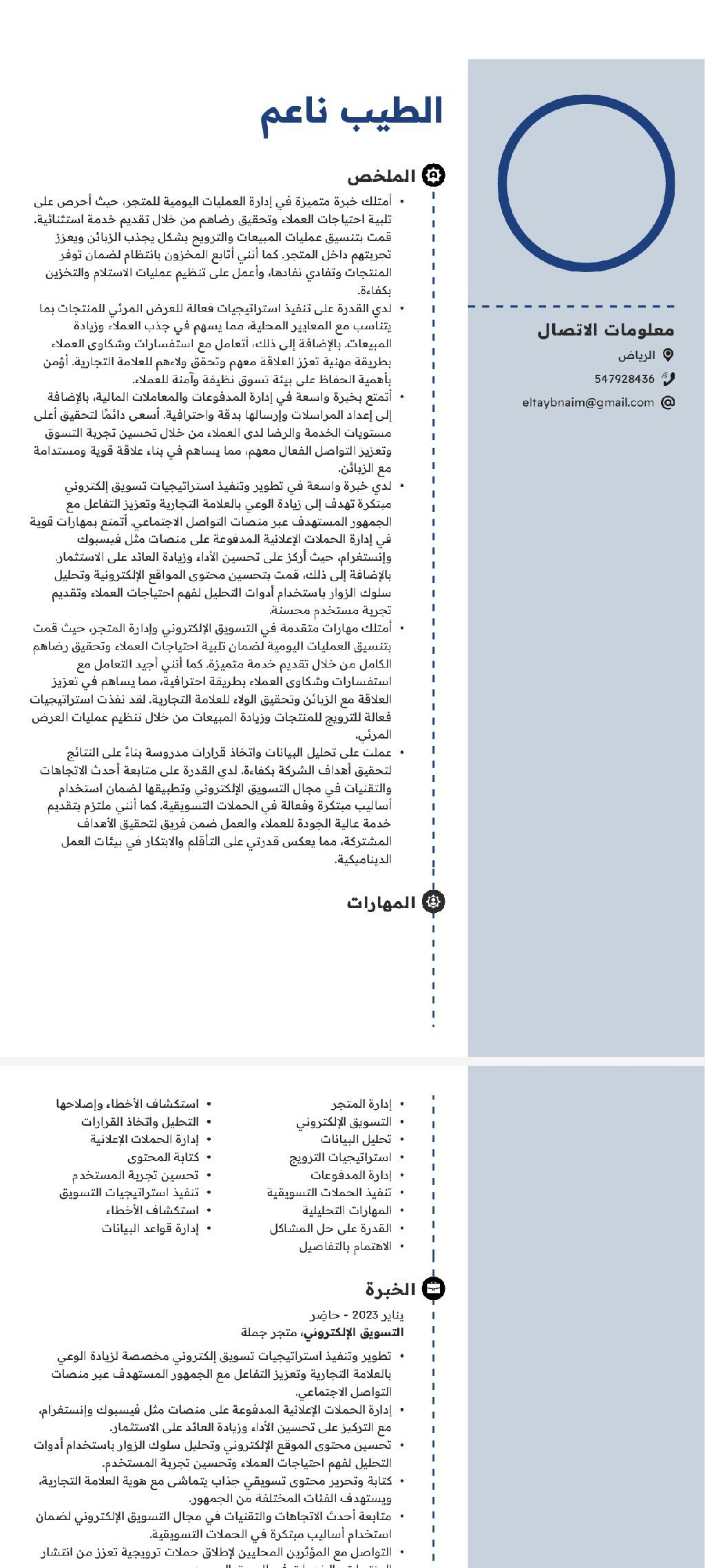 الطيب نعيم مدير حملات اعلانية ومدير متاجر الكترونية - الخدمات التي أقدمها 1) إدارة الحملات الاعلانية - Ads Management تشمل تحليل وضع النشاط التجاري وتحديد الفرص اعداد حملات احترافية (Meta - TikTok - Google) تحسين الميزانية ورفع العائد الاعلاني تصميم واعداد الاعلانات (صور + نصوص) اختبار A B للجمهور والنسخ تقارير أسبوعية واضحة مع توصيات تحسين - 2) إدارة المتاجر الالكترونية - E co