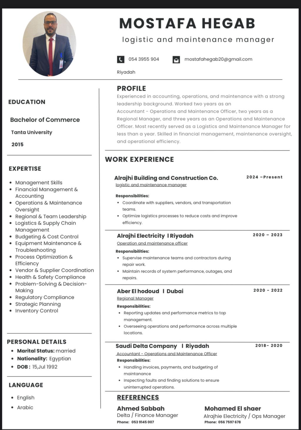 ابحث عن عمل كمدير أسطول في شركة مقاولات أو مدير قسم الصيانة والحركة، معدات وشاحنات، اعمل حاليا مدير قسم الصيانة والحركة بشركة البنية الأساسية للمقاولات، إدارة المنصات الحكومية، منصة واعي، أنظمة التتبع، التعامل مع السائقين، خبرة في صيانة المعدات والشاحنات والسيارات، خبرة في التعامل مع اشتراطات الأمن والسلامة للمعدات الثقيلة بمواقع المشاريع خبرة 8 سنوات في الرياض والمملكة، إقامة سنة، سيارة خاصة