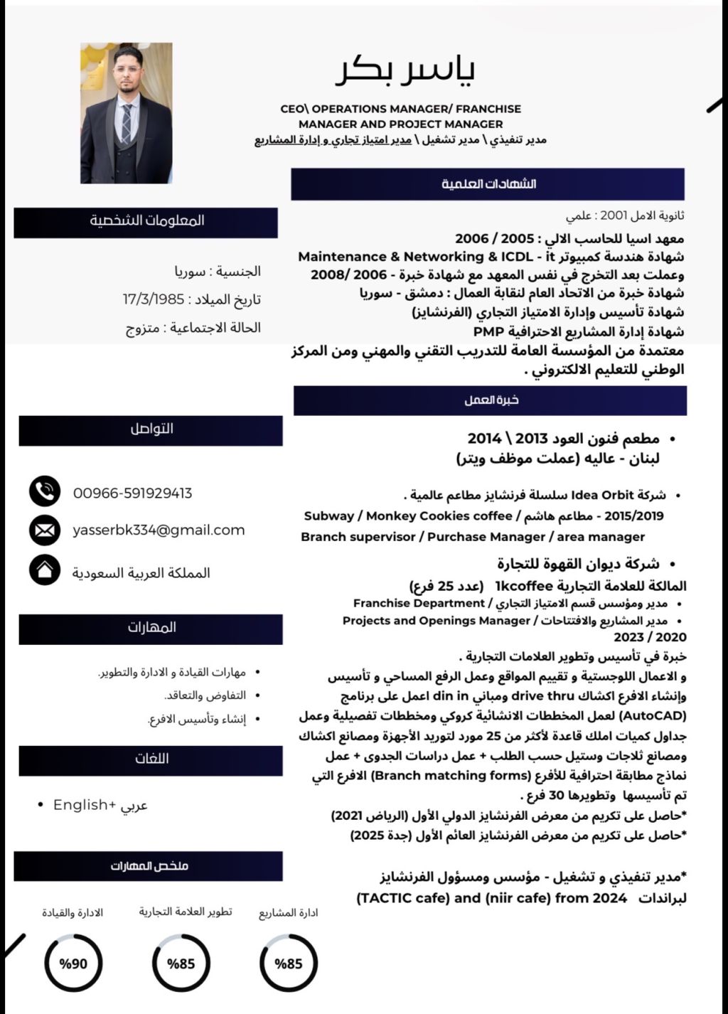 ابحث عن فرصة عمل أملك خبرة طويلة أكثر من 12 سنة في ادارة المقاهي والمطاعم الجنسية / سوري مدير تنفيذي مدير تشغيل / تأسيس وادارة الامتياز التجاري (الفرنشايز) تأسيس وتطوير الفروع عملت في عدة شركات عالمية مطاعم هاشم / مطاعم SUP WAY/ مدير الفرنشايز ومدير المشاريع والافتتاحات في مجموعة مقاهي ون كي / مدير تنفيذي وفرنشايز تكتيك كافية ومدير تشغيل كافية - مدير تنفيذي وتشغيل في KBO حاصل على شهادات تكريم
