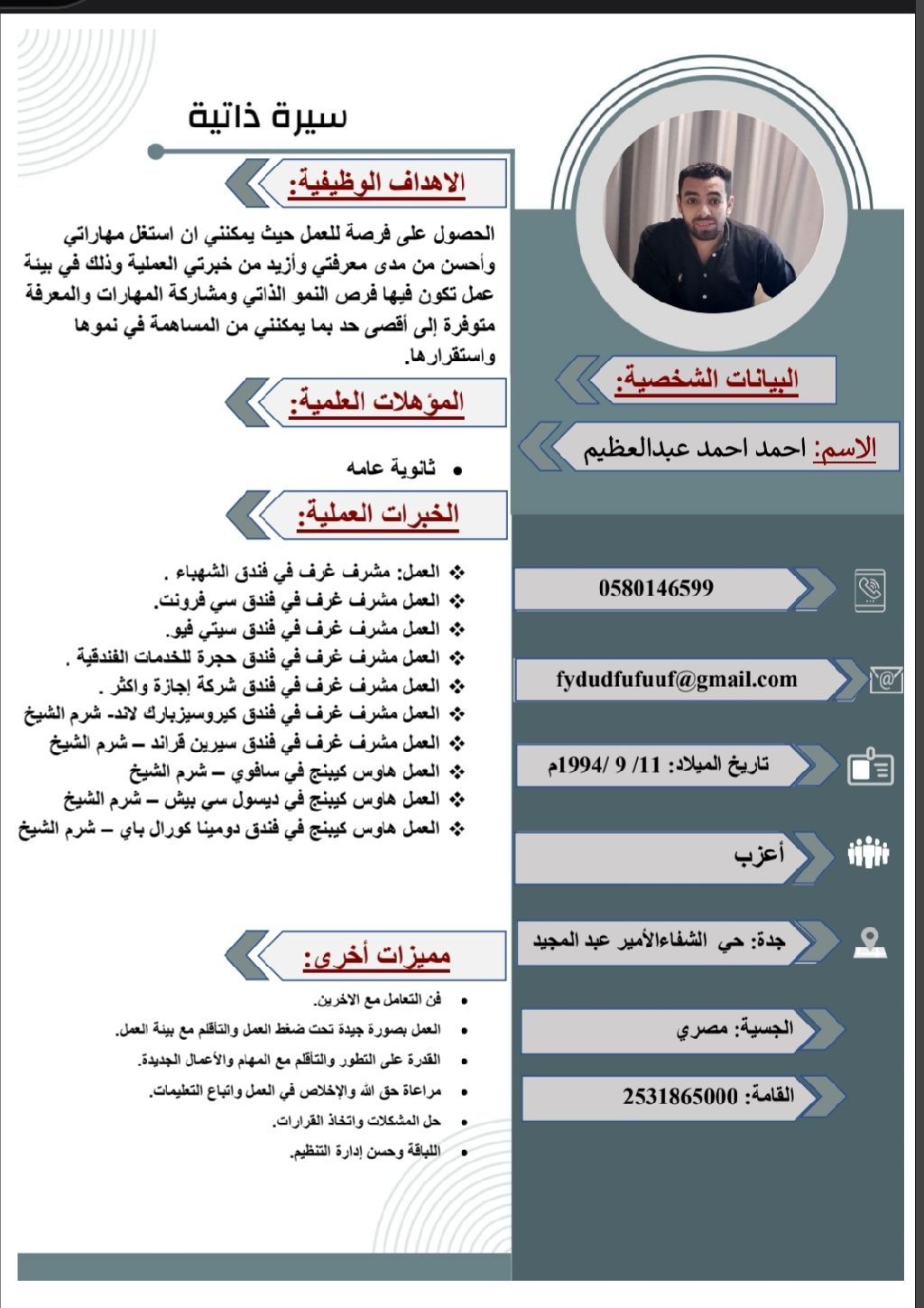 عملت في القطاع السياحي في مصر 10 سنة في شرم الشيخ بقسم الاشراف الداخلي هاوس كيبينج وب المملكة العربية السعودية منذ 3 سنوات بنفس التخصص كمسؤول عام غرف