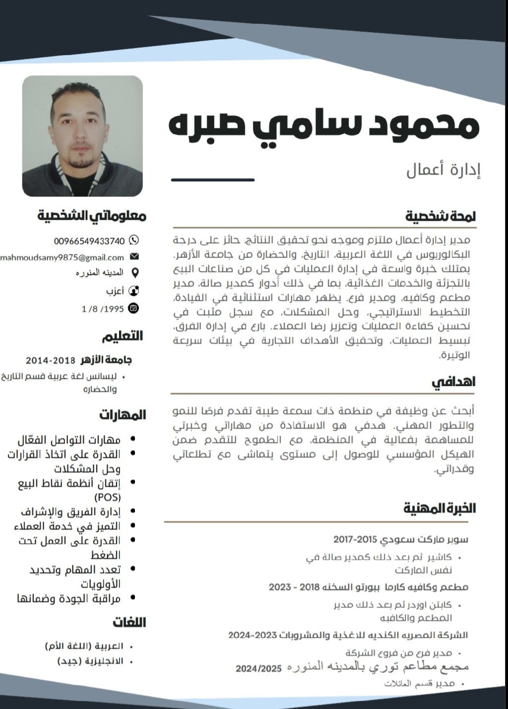 محمود سامي خبرة بإدارة المطاعم والكافيهات أكثر من 8 سنين ابحث عن وظيفة شاغره لدي خبرة وابحث عن مكان أجيد فيه التطوير وقادر علي تقديم محتوي ناجح وفعال وجاهز للعمل ملوحظه أنا مدير صالة محترف وباريستا محترف وجوكر بمجال الكافيهات كاملة ولدي اقامة مهنية سارية المفعول سنة وقادر علي نقل كفالة في أي وقت ممكن