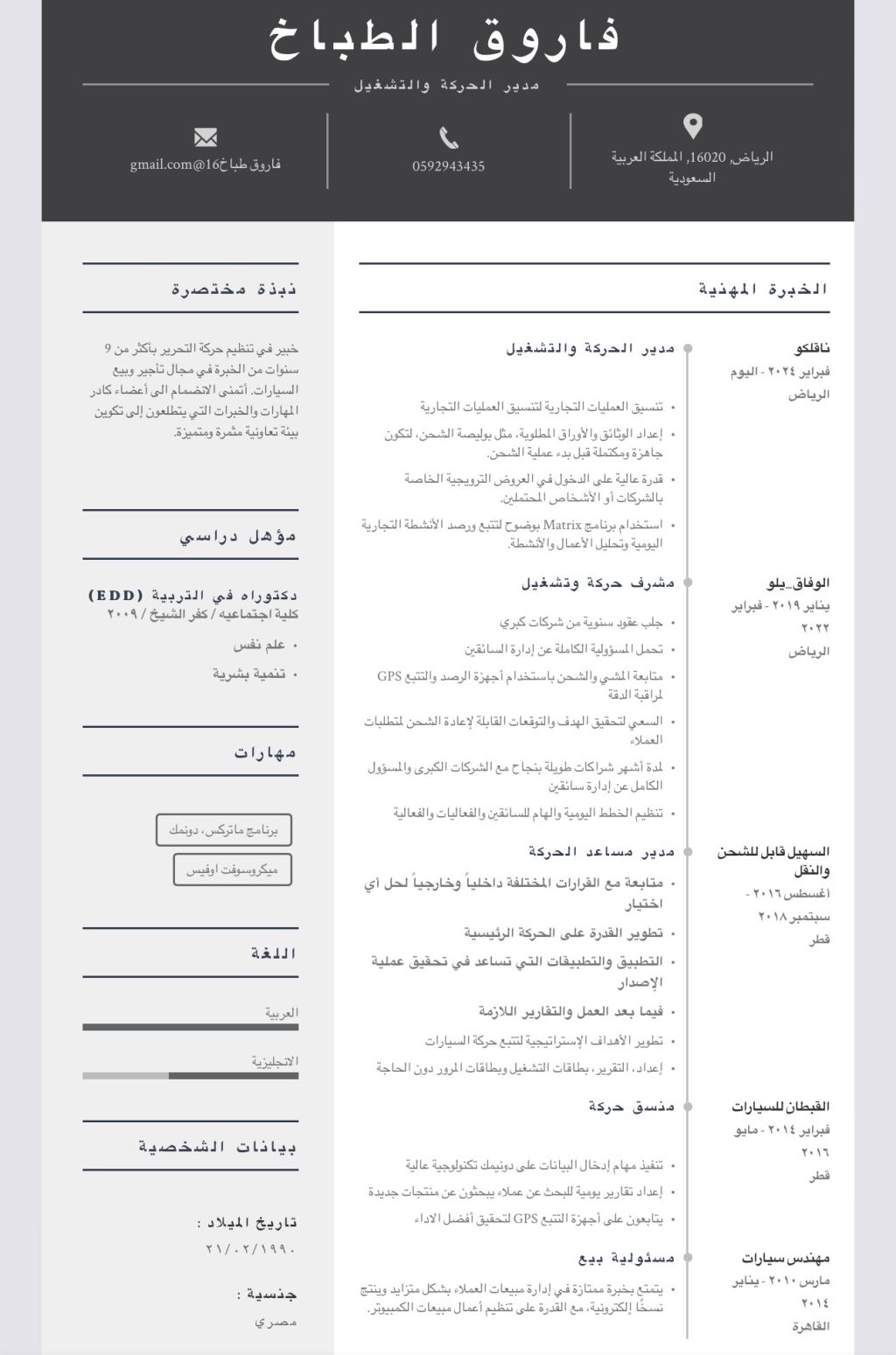 مشرف حركة 3 سنوات سابقا في مجال تأجير السيارات / مدير حركة نقل حاليا بشركة لوجستيك / معرفة شاملة بجميع برامج النقل والتأجير المربوطة بوزارة النقل السعودي / متواجد في الرياض / إقامة سارية سنة / رخصة قيادة