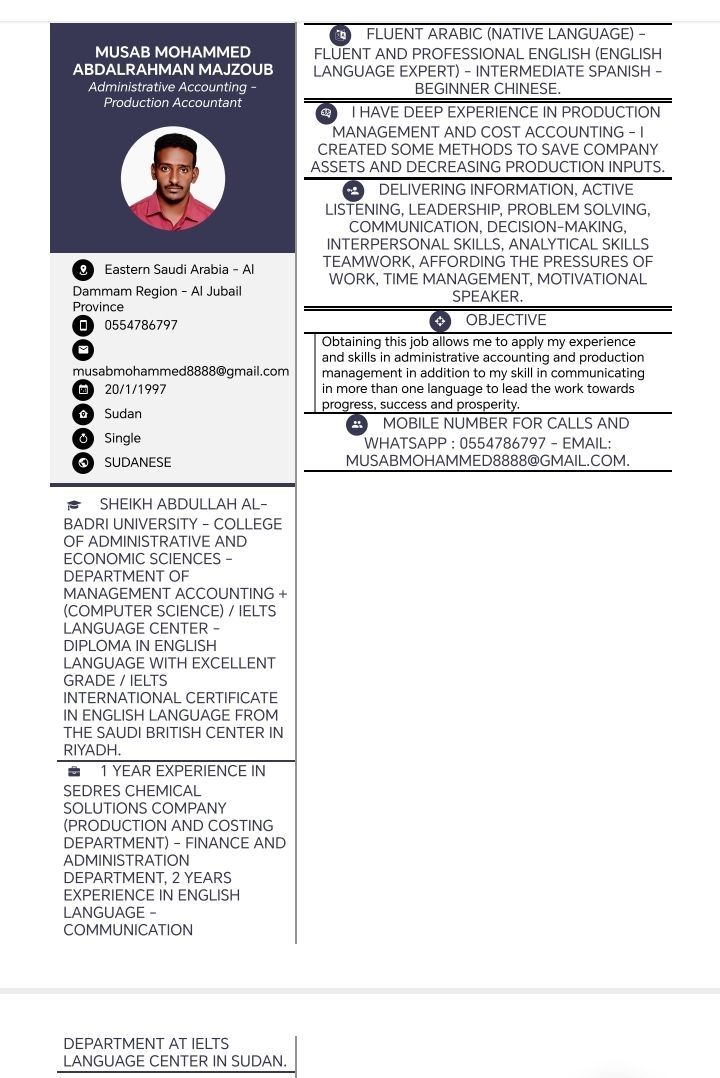 سوداني صاحب خبرات ومهارات في مجال الشركات المصنعة وخبير في إدارة الجودة والانتاج والرقابة وحساب تكاليف المنتجات وماهر في ادخال البيانات، كذلك لدي لغة انجليزية قوية حاصل على شهادة الأيلتس الدولية في اللغة الانجليزية من المركز السعودي البريطاني ابحث عن عمل