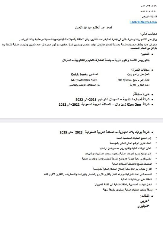 محاسب سوداني 26 سنة خبرة سنتين في المحاسبة العامة والصناعية والتجارية، عملت في شركات رائدة في مجالات التجارة والصناعة، وخاصة في قطاع الملابس والتصنيع. الرقابة على المخزون، التسويات البنكية، وتحليل البيانات المالية. ابحث عن عمل مع نقل كفالة موجود رخصة قياد