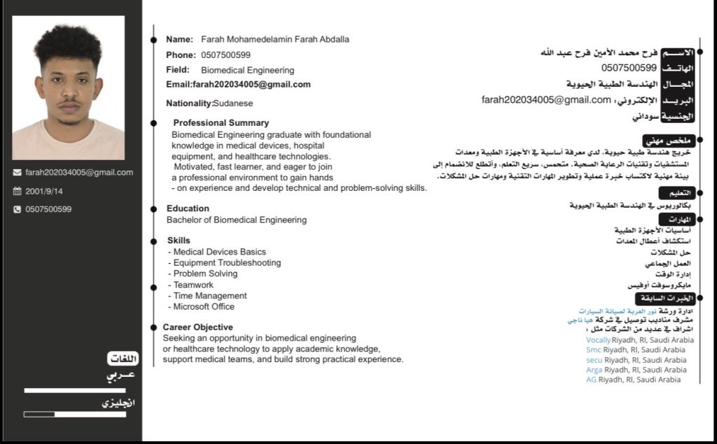 ابحث عن عمل أنا فرح محمد الأمين مهندس طبي حديث التخرج ابحث عن عمل أجيد الادارة وسريع التعلم في أي مجال إقامة رخصة سارية