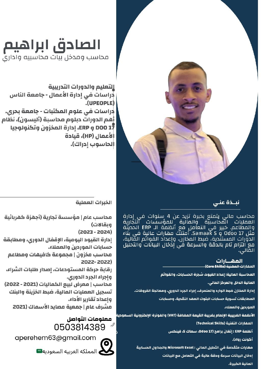 محاسب سوداني خبرة 4 سنوات في السعودية مقيم في السعودية متاح للعمل) 1 خبير في الدورة المستندية والزكاة والضريبة والإقفالات المالية. مهارة احترافية في البرامج (Odoo، الأمين كريستال رواء فينيسيا Excel) ادخال القيود وتدقيق الحسابات بدقة. اعداد الميزانيات والقوائم المالية. جاهز لتنظيم حساباتكم بخبرة تقنية ومحاسبية واسعة. للتواصل