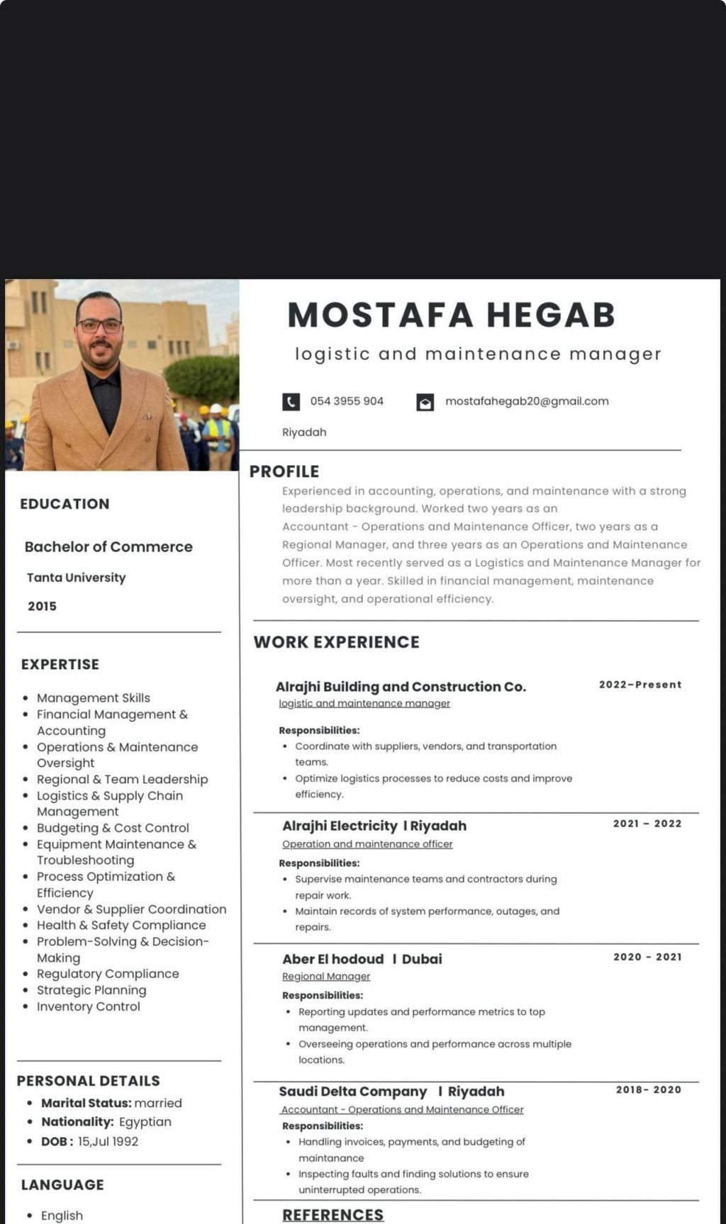 اعمل كمدير أسطول في شركة مقاولات أو نقليات، معدات وشاحنات، اعمل حاليا مدير قسم الصيانة والحركة بشركة الراجحي للبناء والتعمير، إدارة المنصات الحكومية (تم، لوجستي، منصة بيان) منصة واعي، أنظمة التتبع، التعامل مع السائقين، خبرة في صيانة المعدات والشاحنات والسيارات، خبرة في التعامل مع اشتراطات الأمن والسلامة للمعدات الثقيلة بمواقع المشاريع خبرة 8 سنوات في الرياض والمملكة، إقامة سارية