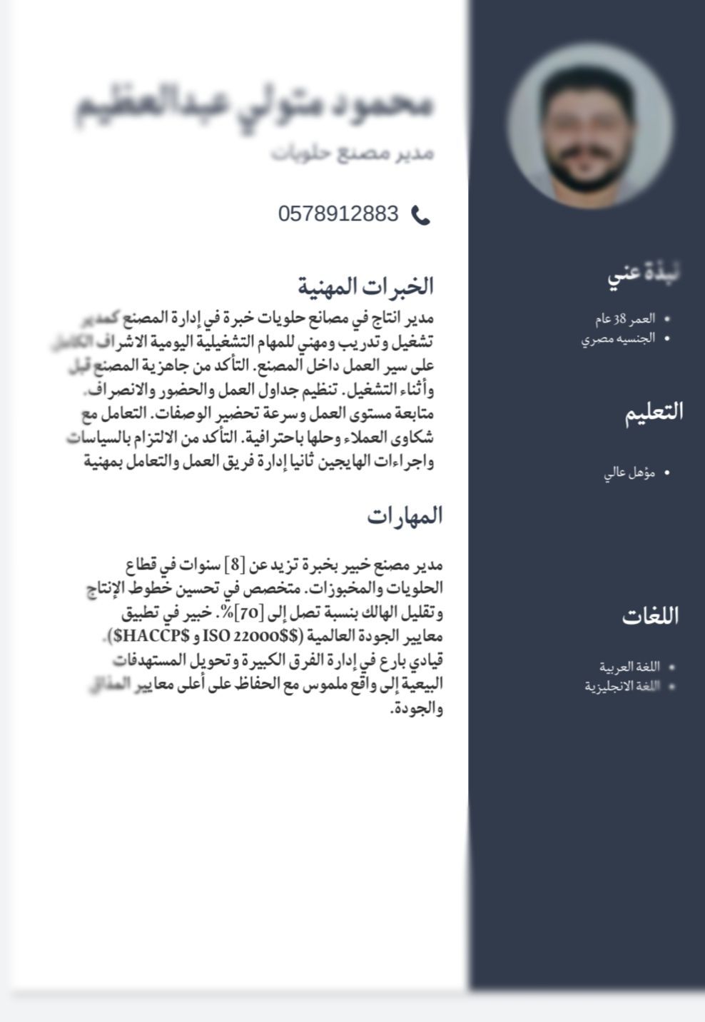 مدير انتاج في مصانع حلويات خبرة في إدارة المصنع كمدير تشغيل وتدريب ومهني للمهام التشغيلية اليومية الاشراف الكامل على سير العمل داخل المصنع. التأكد من جاهزية المصنع قبل وأثناء التشغيل. تنظيم جداول العمل والحضور والانصراف. متابعة مستوى العمل وسرعة تحضير الوصفات. التعامل مع شكاوى العملاء وحلها باحترافية. التأكد من الالتزام بالسياسات واجراءات الهايجين ثانيا إدارة فريق العمل والتعامل بمهنية