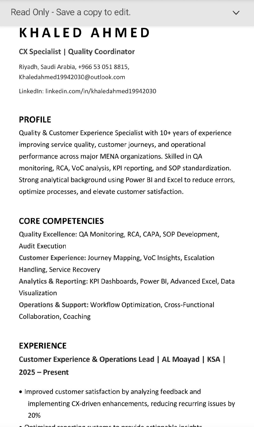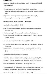بدور حاليا على فرصة شغل في Customer Experience Quality Operations. معيا أكثر من 10 سنين خبرة في شركات كبيرة زي Delivery Hero (Talabat) Noon، OSN, KFG. خبرتي تشمل QA، VoC، CSAT، SLAs، KPIs وتحسين تجربة العميل من Pre & Post Sales لحد Customer Support. كمان عندي خبرة في إدارة السوشيال ميديا، صناعة المحتوى، وتطوير ظهور الأنشطة على منصات زي HungerStation وMrsool وNinja
