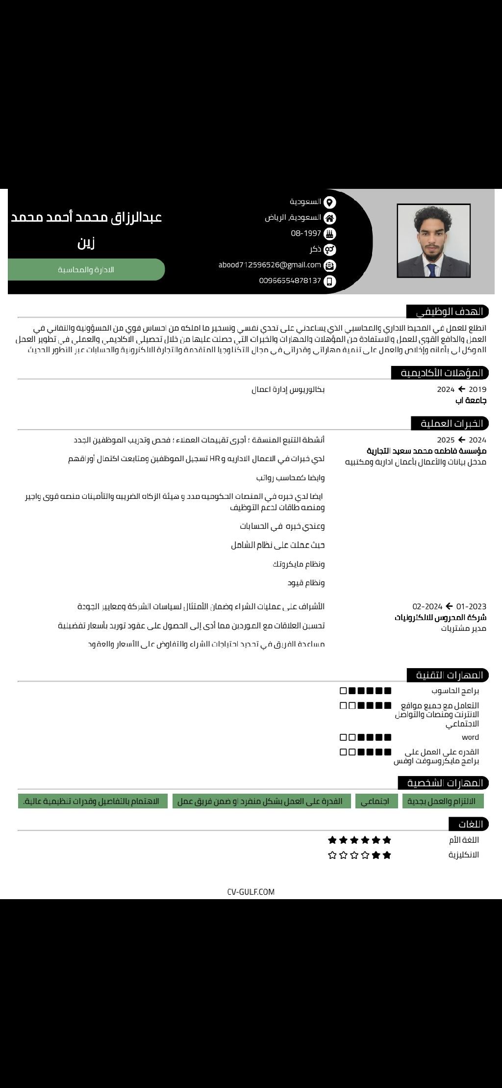 ابحث عن عمل عملت سابقا محاسب رواتب من اعداد مسير الرواتب ومتابعه الموظفين حضور وانصراف وتسجيل التأخيرات وعمل الجزاءات وفق للوائح وعمل المخالصات المالية للمنتهية خدمتهم رفع ملف حماية الأجور على منصة مدد العمل أيضا على منصة مقيم قوى هدف - دعم التوظيف - التأمينات الاجتماعية أيضا لدي خبرة بسيطة في المحاسبة المالية