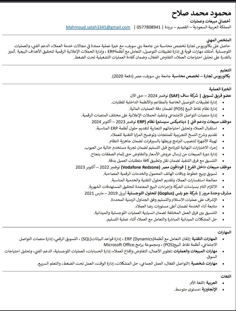 ملخص الخبرة المهنية محترف ذو توجه نحو تحقيق النتائج، حاصل على درجة البكالوريوس في المحاسبة، ويتمتع بخبرة واسعة في خدمة العملاء، والدعم الفني، والعمليات اللوجستية. لديه سجل حافل في إدارة تطبيقات التوصيل، وأنظمة تخطيط موارد المؤسسات (ERP) وحملات التسويق الرقمي لدفع عجلة نمو الأعمال. يتمتع بمهارات تحليل احتياجات العملاء، والتفاوض على الصفقات، وضمان الكفاءة التشغيلية تحت الضغط. ملتزم بتقديم خدمة عالي