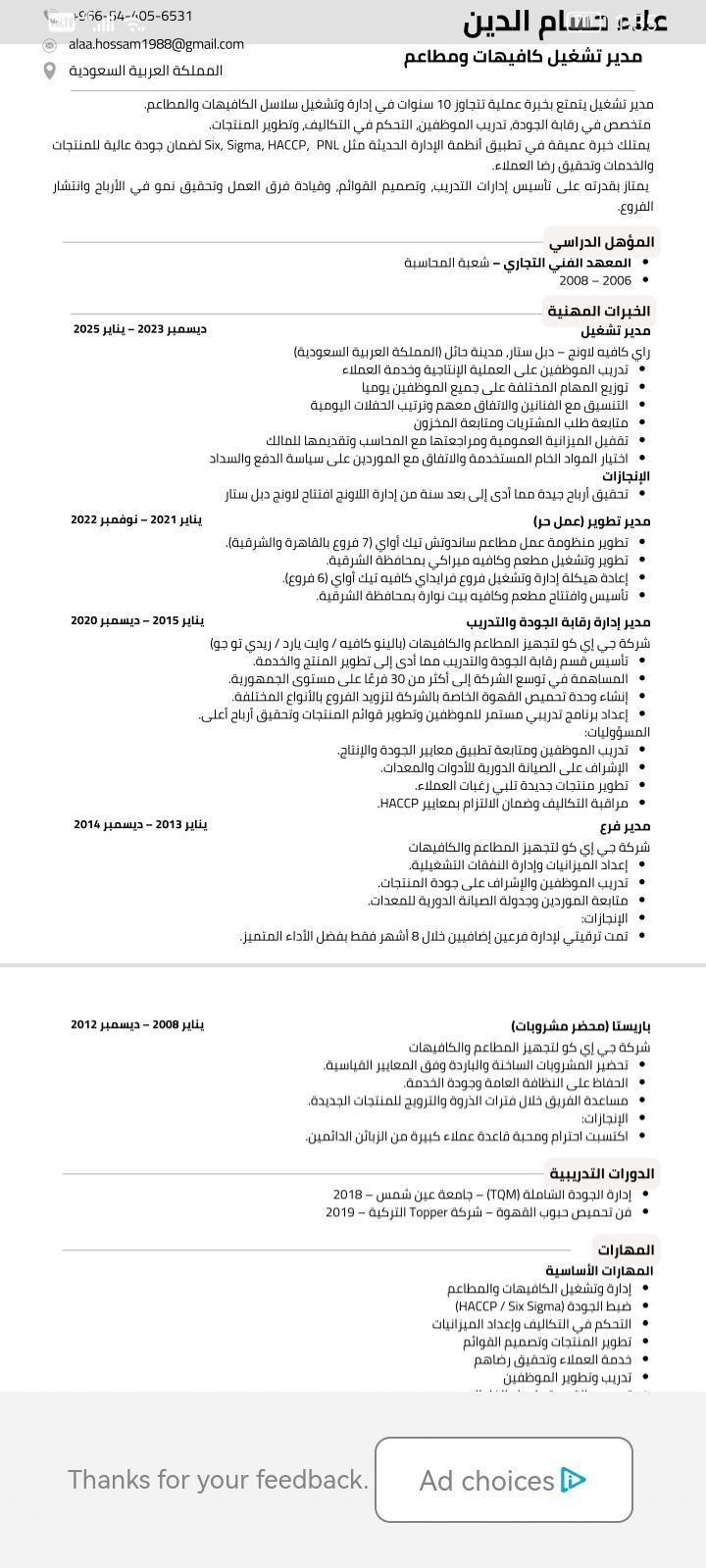 ابحث عن وظيفة مدير كافية أو مطعم أو لاونج متواجد بالمملكة العربية السعودية إقامة سارية المفعول